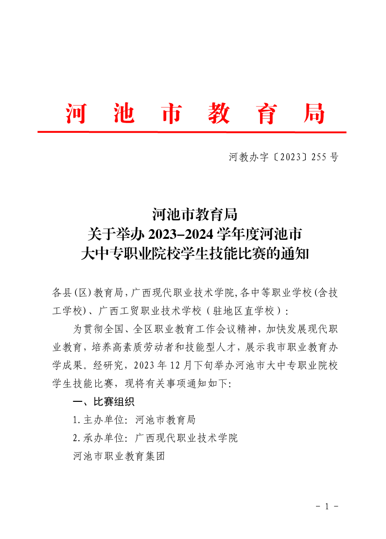 河池市教育局关于举办2023-2024学年度河池市大中专职业院校学生技能比赛的通知 来源:职教集团 发布时间:2023-12-04 22:07:27 浏览次数: 次 【字体:小 大】 终审:gxxdzhc001 【打印正文】 相关信息