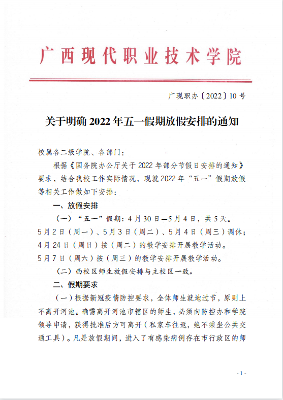 关于明确2022年五一假期放假安排的通知 来源:教师教育学院/蒋峥 发布时间:2022-04-21 08:20:38 浏览次数: 次 【字体:小 大】 终审:gxxdjyx001 【打印正文】 相关信息