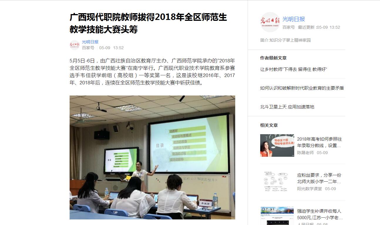 [光明日报]广西现代职院教师拔得2018年全区师范生教学技能大赛头筹
