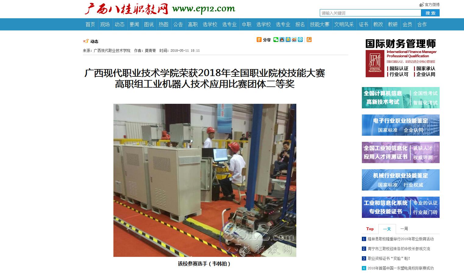 [八桂职教网]优米体育入口官网下载手机版荣获2018年全国职业院校技能大赛高职组工业机器人技术应用比赛团体二等奖 来源: 发布时间:2018-05-11 20:34:18 浏览次数: 次 【字体:小 大】 新闻截图: 【打印正文】 相关信息