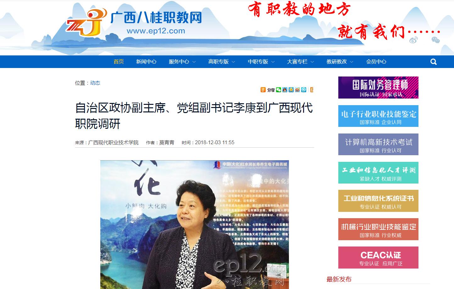 [八桂职教网]自治区政协副主席、党组副书记李康到广西现代职院调研 来源: 发布时间:2018-12-03 15:06:00 浏览次数: 次 【字体:小 大】 新闻截图: 终审:administrator 【打印正文】 相关信息