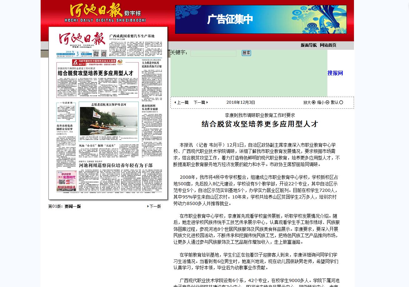 [河池日报]李康到我市调研职业教育工作时要求 结合脱贫攻坚培养更多应用型人才 来源: 发布时间:2018-12-03 15:11:00 浏览次数: 次 【字体:小 大】 新闻截图: 终审:administrator 【打印正文】 相关信息