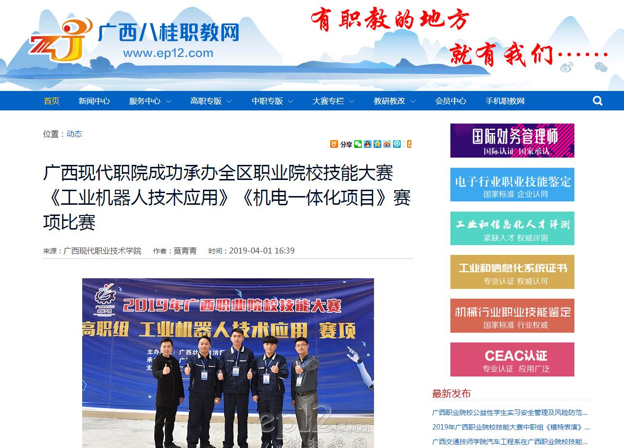 [八桂职教网]广西现代职院成功承办全区职业院校技能大赛《工业机器人技术应用》《机电一体化项目》赛项比赛 来源: 发布时间:2019-04-03 15:20:49 浏览次数: 次 【字体:小 大】 新闻截图: 【打印正文】 相关信息