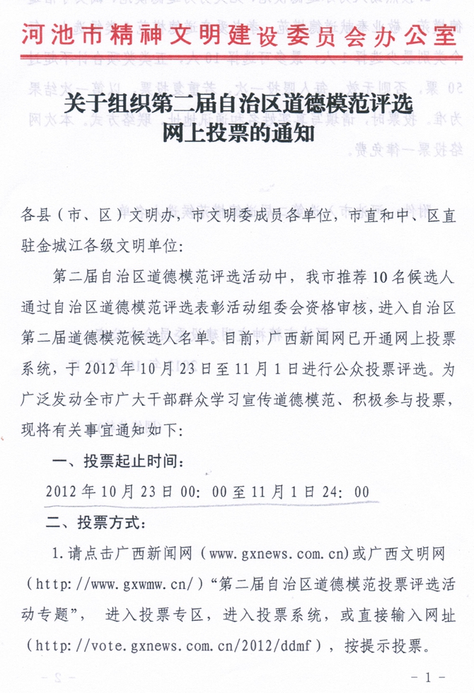 关于组织第二届自治区道德模范评选网上投票的通知 来源: 发布时间:2012-10-29 09:02:22 浏览次数: 次 【字体:小 大】 关于组织第二届自治区道德模范评选网上投票的通知 院属各单位、部门: 接市文明办通知,第二届自治区道德模范评选活动中,我市推荐10名候选人通过自治区道德模范评选表彰活动组委会资格审核,进入自治区第二届道德模范候选人名单,要求我院全体师生学习宣传道德模范,积极参与投票。具体内容详见附件。 附件:关于组织第二届自治区道德模范评选网上投票的通知 院长办公室 2012年10月29日 【打印正文】 相关信息
