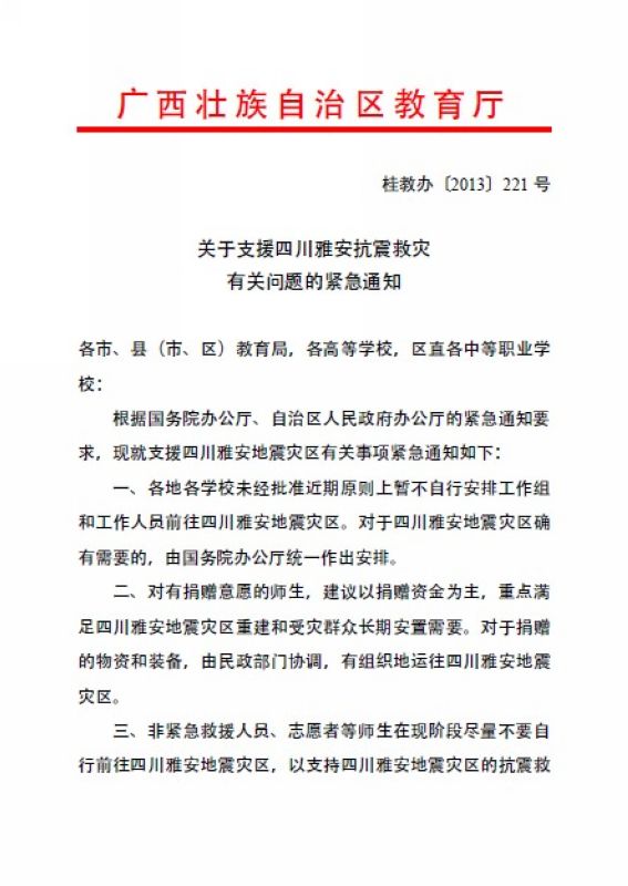 桂教办〔2013〕221号关于支援四川雅安抗震救灾有关问题的紧急通知