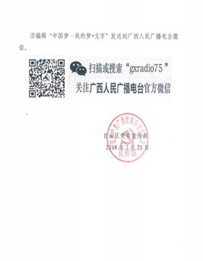 现将自治区党委宣传部《关于开展“中国梦·我的梦”——全区征文活动的通知》(桂宣字﹝2014﹞29号)转发给你们,请按照要求组织本总支广大师生积极参加,并于2014年6月15日前将推荐上送的参加作品电子版统一发至学院党委宣传部邮箱:gxxdzyxcb@163.com。