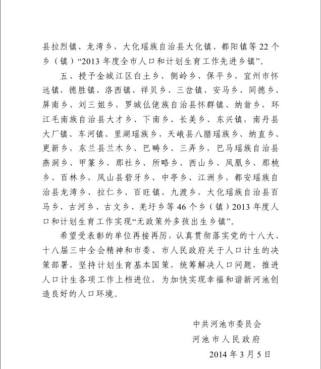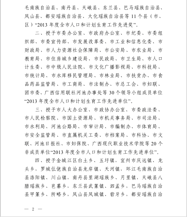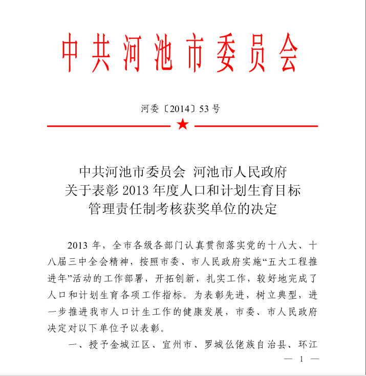 关于转发《中共河池市委员会 河池市人民政府关于表彰2013年度人口和计划生育目标管理责任制考核获奖单位的决定》的通知 来源: 发布时间:2014-04-18 11:03:42 浏览次数: 次 【字体:小 大】 【打印正文】 相关信息