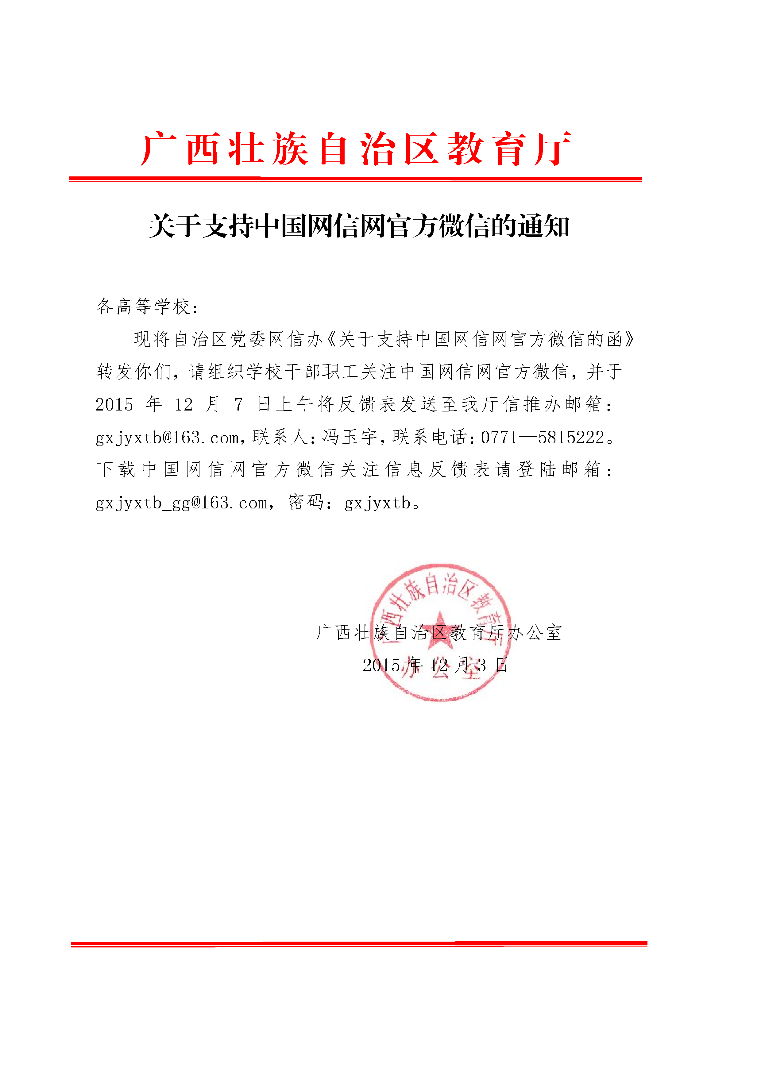 转发教育厅文件《关于支持中国网信网官方微信的通知》的通知 来源: 发布时间:2015-12-07 17:31:10 浏览次数: 次 【字体:小 大】 通 知 院属各部门、各单位: 现将自治区教育厅文件《关于支持中国网信网官方微信的通知》转发给你们,请组织教职工关注该微信,并将本部门关注人数于2015年12月8日下午16时前,汇总反馈到计算机网络中心内网60相应文件夹中。 优米体育入口官网下载手机版院长办公室 2015年12月7日 【打印正文】 相关信息