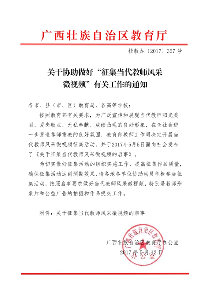 附件:桂教办〔2017327  关于协助做好“征集当代教师风采微视频”有关工作的通知