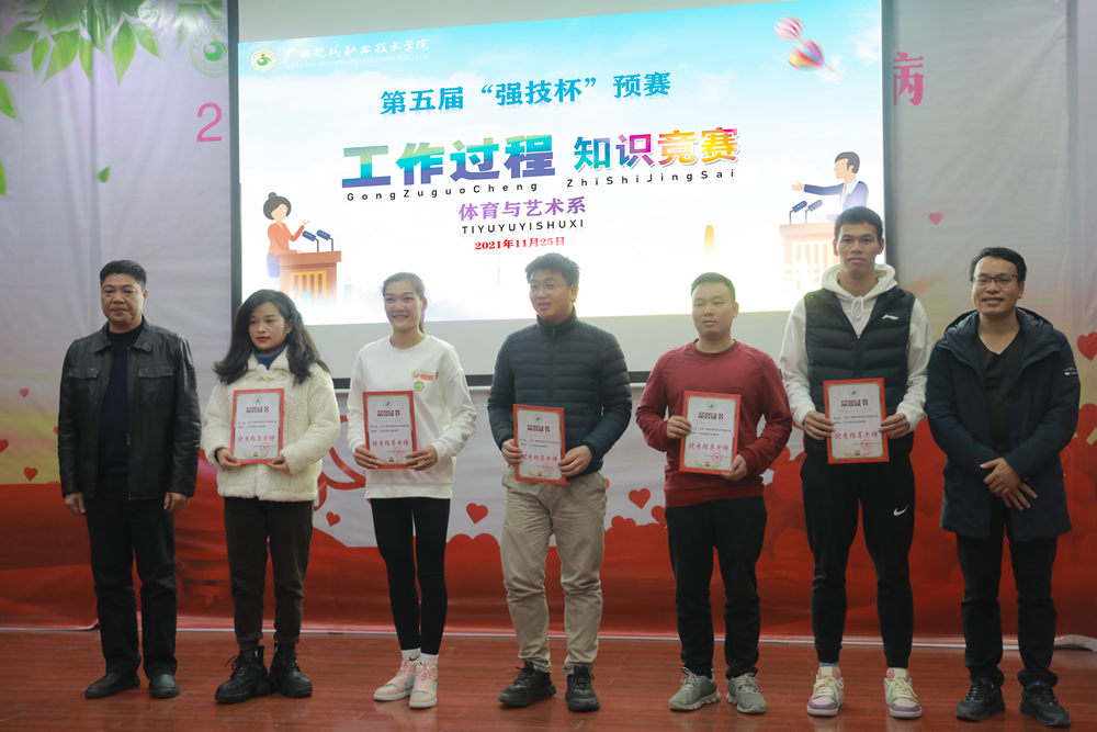 11月25日晚,学院体育与艺术系在第二学术报告厅举办第五届“强技杯”工作过程知识竞赛预赛活动。教务处副处长匡华副教授、体育与艺术系主任刘志峰副教授、体育与艺术系韦海宏书记、教育系韦新梅副主任、建筑系副主任胡钟月副教授、教育系李淑香老师出席活动并担任评委。