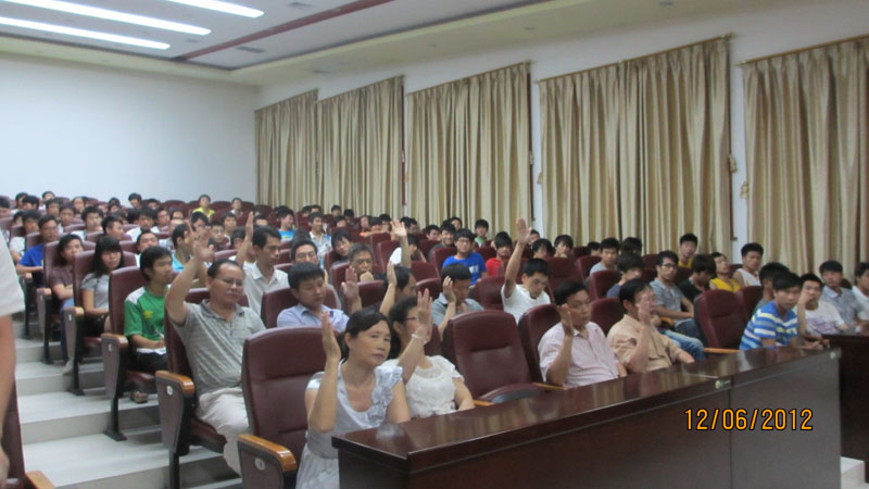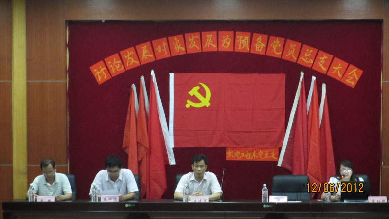 本站机电工程系讯(杨鸿生、谭权、韦美金)2012年6月12日晚上20点,机电工程系党总支在学院第一学术报告厅召开2012年上半年发展预备党员讨论大会。本次大会由党总支部组织委员韦红娜老师主持,出席本次大会有机电工程系党总支书记韦建军老师等5位支部委员以及党总支全体正式党员、预备党员、入党积极分子,人数达242人。
