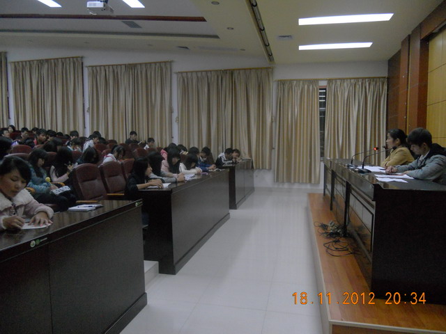 管理系、外语系讯(钟剡、韦园)2012年11月18日晚,管理工程系、外国语系在学院第一学术报告厅召开团总支、学生会干部及学生会候补成员交流会。管理工程系、外国语系党总支副书记黄耀老师参加了会议,会议由学生会副主席李佰林同学主持。
