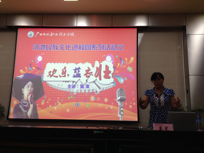 经济管理系、教育系讯 2014年6月16日晚,河池民族文化走进校园系列活动之一的“欢乐蓝衣壮”专题讲座在学院第一学术报告厅举行。本次讲座邀请了莫茉老师主讲。莫茉老师在音乐创作、编曲等专业领域内具有独特的建树,可以出口成歌。