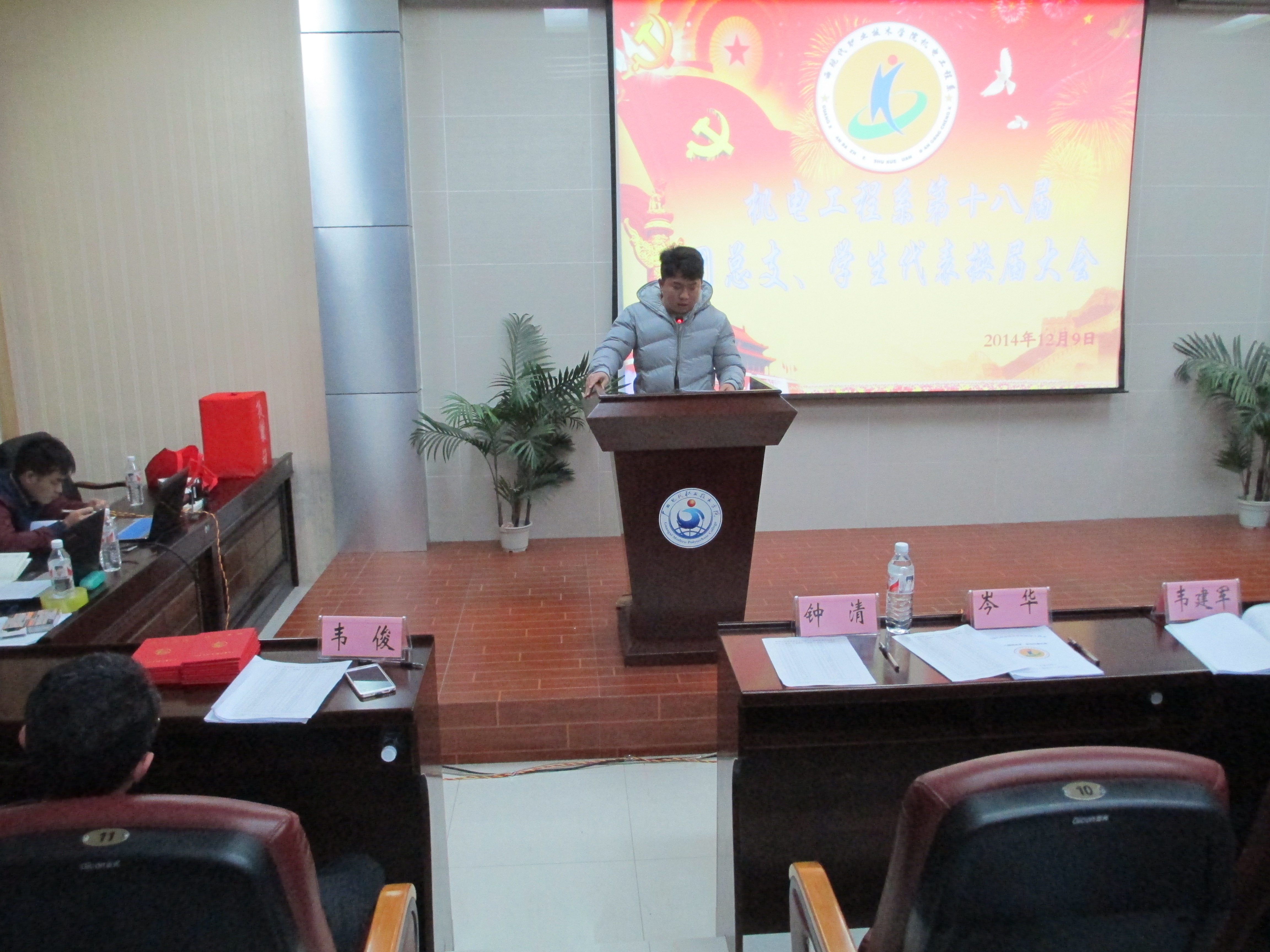 伴随着庄严的国歌声,本次大会了拉开序幕。首先是机电工程系团总支书记韦俊致开幕词,他充分肯定了本届学生干部的作用,并鼓励下一任的学生干部要秉承优秀传统,共同努力,更好的为学生服务。