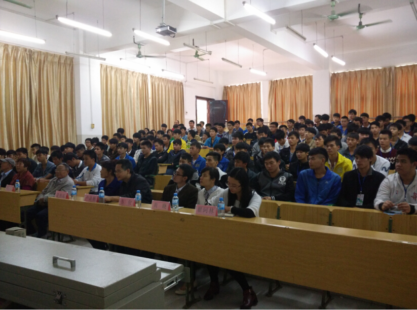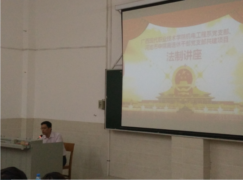 为提升机电工程系师生的法律意识,大力弘扬法治精神,创建和谐校园,2015年11月3日下午,机电工程系于第一教学楼第二阶梯教室展开以“劳动有法,法伴我行”为主题的专题讲座。河池市中级人民法院退休干部刘宝书老先生做为本次讲座的主讲人,机电工程系党总支副书记李和明担任本次讲座主持,河池市中级人民法院调研员、工会主席、机关党委副书记蒙燕妮,离退休干部党支部书记林军、副书记田兴亮,机关党委工作人员韦兰清,学院组织部副部长卢喜朋,机电工程系团总支书记罗明都,辅导员韦俊、黄晓、翟阿林,以及系学生会正式成员和候补成员、入党积极分子也参加了本次讲座。