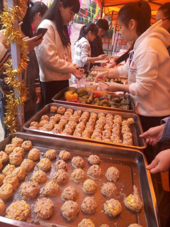体验民俗,弘扬传统。在学校食堂前摆在长桌上的是同学们自己制作的美食,各位同学也是热情的前来品尝,同学们也是开心的不亦乐乎!
