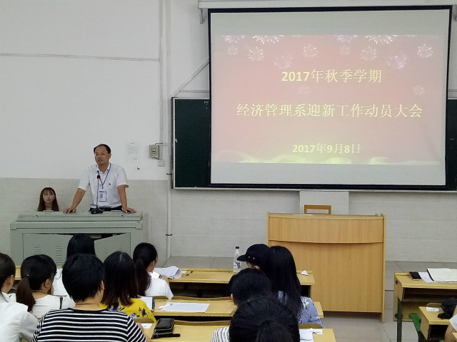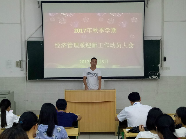 【经济管理系讯】为迎接17级新生的到来,2017年9月8号中午十二点整经济管理系在第一教学楼第二阶梯教室召开迎新动员大会,参加此次会议的有系部的杨奎主任,叶秉高书记,陈建伶老师和各17级班主任,班助以及我系学生干部和我系志愿者。