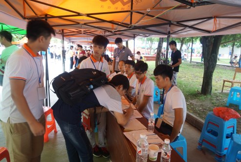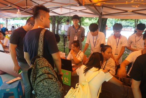 首先,经过充分的准备工作,而迎新成员早早的就来到了校门接待点,新生接待工作正式开始。大约7点半,一些家长和学生陆陆续续的来到了学校,迎新的每一位成员都能积极的参与,以热情的姿态接待了每一位到来的新生,并同时接过他们的行李后,带领他们入住了宿舍,领取了被褥,然后迅速的进行了注册,全系有条不紊的带领新生完成了报道的所有程序。天公不作美,下午一场淅淅沥沥的小雨不请而至,但这并没有浇灭学长学姐的热情,他们克服了天气的影响,反而更加用心的投入到了服务新生的工作去。