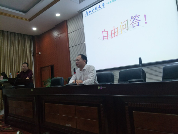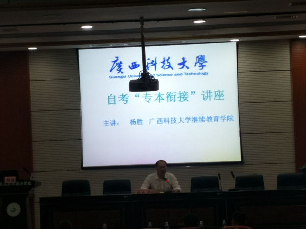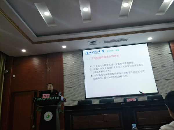 本次宣讲会由广西科技大学继续教育学院杨胜副院长亲自主讲,杨院长从广西科技大学简介、什么是“专本衔接”、自学考试简介、“专本套读”为什么选择自考这种形式、“专本衔接”专业及政策、参加“专本衔接”学习的好处、毕业条件及待遇、学习形式及学费、报名方式等十个方面深入浅出的介绍了“专本衔接”的情况,让同学们对“专本衔接”有了一个比较清晰的了解,杨院长还现场答疑,就同学们提出的关于“专本衔接”就读的一些疑虑和迷惑一一做了解答。