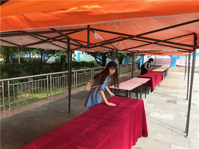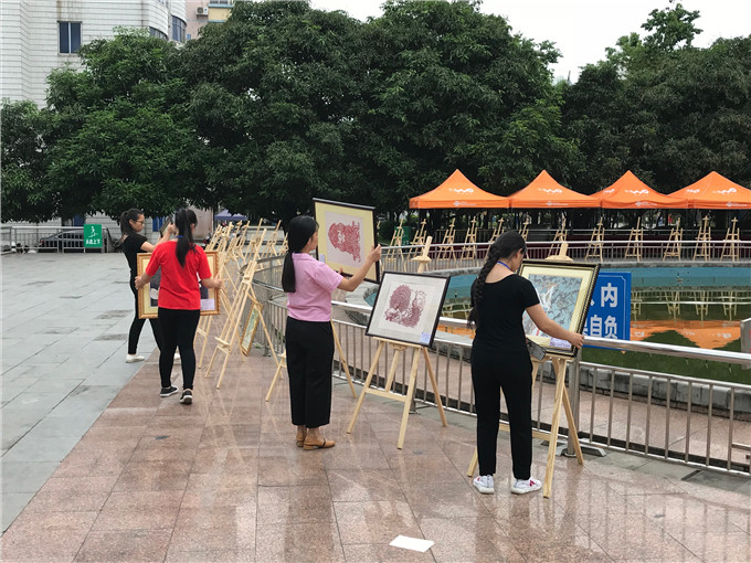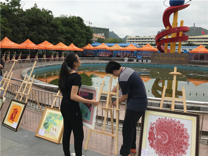 虽然今日的天气不尽人意,但是阻止不了教育系学生会同学们的热情高涨,在莫然、韦海宏、韦竣烽三位老师的指导下,成功完成了今日的布展活动,将几十幅、件凝结着学生们辛劳汗水的作品,有规律、有秩序地摆放在我校喷泉广场周围,完成了场地的布置活动。