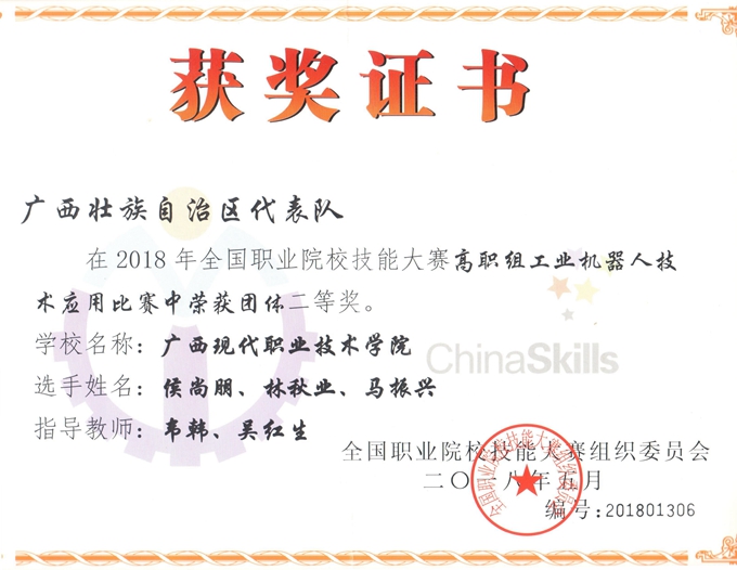 技能大赛创佳绩,捷报频传奏凯歌。由教育部、科学技术部、工业和信息化部等部门主办的2018年全国职业院校技能大赛高职组工业机器人技术应用赛项比赛,于5月6日至5月8日在天津现代职业技术学院举行。来自全国28个省、直辖市、自治区的76支参赛队伍共计228名选手参加了本次比赛。我院机电工程系韦韩老师、吴红生老师指导的学生侯尚朋、林秋业、马振兴,在异常激烈的角逐中,不畏强手、奋勇拼搏,一路过关斩将,荣获2018年全国职业院校技能大赛高职组工业机器人技术应用比赛团体二等奖!创造了学院成立以来学生技能竞赛的最好成绩!(转自学院新闻,侵删。)