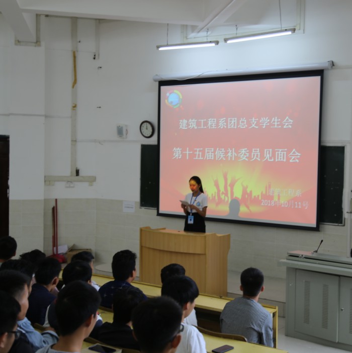 建筑工程系讯 2018年10月11日中午,建筑工程系第十五届团总支学生会候补委员在第一教学楼第一阶梯教室与我系党总支副书记罗皓、团总支书记周凤秀,以及第十四届团总支学生会成员见面。