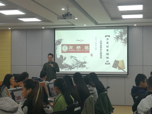 讲座上,韩教授分享了创业过程中最重要的几个要点,包括坚持精神,竞争意识,不怕苦不怕难的心态。又通过创业成功的案例来分析解释创业模式。并通过商业价值分析,引导同学们讨论武大郎的悲剧。讲座上同学们认真听讲,气氛活跃。
