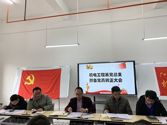 3月4日上午,我系在机电大楼C502召开2018-2019年度下学期教职工大会暨机电工程系党支部党员会议。系部主任岑华、系部党支部书记黄仕珍,系部副主任吴杰、韦韩、蒙港、覃壮出席会议。会议由系部党支部书记黄仕珍主持。 会上,系部系部副主任吴杰、韦韩、蒙港、覃壮分别作了本学期实习、就业、技能考证,科研工作、实训室管理,教学、内部质量诊改,驾校招生等工作的部署。 系部主任岑华在会上强调,全系教职工在新学期要继续以强烈的责任感和良好的精神面貌,以饱满的热情投入到工作岗位上。并给全系教职工领学人民日报文章《你凭什么在单位立足》。 又讯,系部教职工大会结束后,紧接着召开机电工程系党支部党员会议。会议由党支部书记黄仕珍主持。 会上,教师预备党员覃壮同志、岑土恩同志,学生党员汪云田同志、车申七同志提出按期转为正式党员的申请。在各支部党委委员同志代表党支部宣读综合考察意见后,与会党员对申请人能否按期转为正式党员进行讨论并开展无记名投票。经大会讨论,同意4名同志转为中共正式党员。