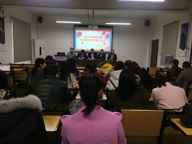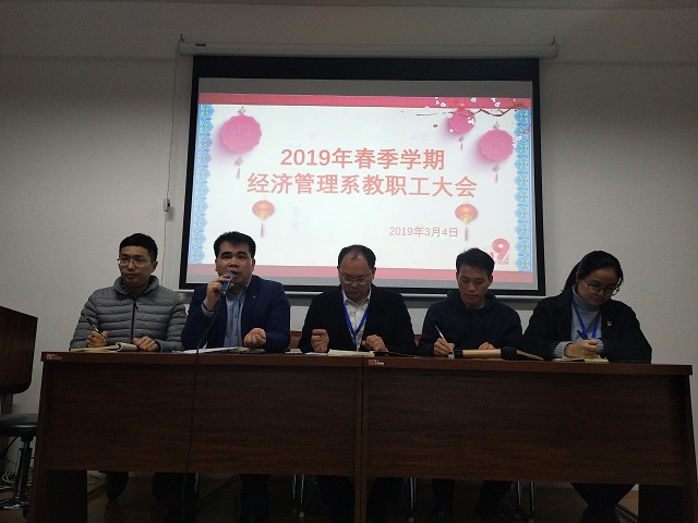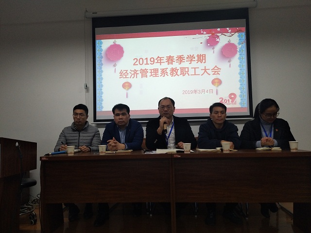 经济管理系召开2019年春季学期全体教职工大会 2019年3月4日早上8:30,经济管理系在电商大楼二楼会议室召开2019年春季学期经济管理系全体教职工大会,经管系主任杨奎,党总支书记卢绍迎,副主任潘杨,副主任叶秉高,副主任刘泽汀出席会议,全体教职工参加会议。会议由我系副主任叶秉高主持。 经管系主任杨奎在会上从五个方面解读我系新一学年来的工作。会上,杨主任对过去一年里我系取得的成绩以及存在的问题进行剖析,并指出我系在本学期将明确学院的决心,以专业建设为抓手,校企合作协同育人等为系部重点工作,提出我系要建设一支“用于担当、善于攻坚、乐于事业、奋斗出彩”的教师团队,为系部,为学院发展做贡献。 会上,我系党总支书记就学生管理工作进行部署,强调开学初各个班主任要加强对学生的安全工作进行排查,对卫生工作进行监督,加强对学生意识形态的教育,以及学生的规矩意识。最后卢书记提出所有学生的工作,作为教师应该将问题发现于一线,同时将其解决于一线。 系部各个分管领导对于各自分管的工作进行开学初部署。