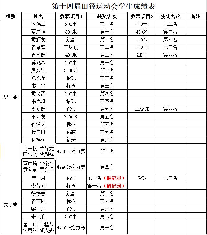 其中,女子标枪和女子跳远两项破纪录,男子4x100m接力赛连续3年荣获冠军。