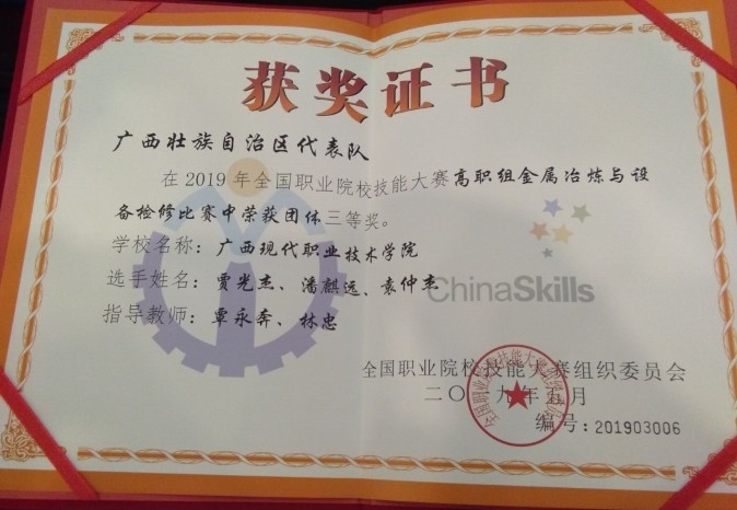 2019年全国职业院校技能大赛金属冶炼与检修赛项在天津冶金职业技术学院举行,本次赛项共有来自全国30个冶金职业院校,90名参赛选手参赛。在高手如云的比赛中,我系贾光杰、潘麒远、袁仲杰三位同学不畏强敌,沉着发挥、勇夺三等奖,为我院荣得了荣誉。我们对获奖学生及团队表示热烈的祝贺,同时号召广大学生以他们为学习榜样,学习他们不怕困难,争分夺秒的学习精神,为学院争得更大的荣誉。