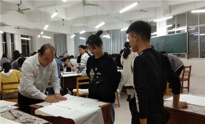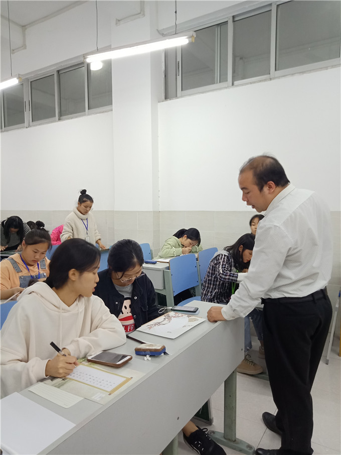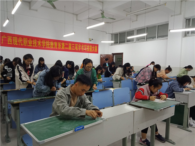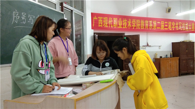 为贯彻落实中共中央、国务院《关于全面深化新时代教师队伍建设改革的意见》精神,强化学生“钢笔字、毛笔字、粉笔字”教学基本功和教学技能训练的精神,提高我系学生三笔字功底,2019年11月19日晚上8:00,我系在一教418教室举办了第二届三笔字书写技能大赛。经过各班初赛,最终116名同学进入系部决赛。本次比赛由覃始泽、韦荣周、蒙家辉三位老师担任评委,韦新梅、梁建梭副主任到场指导。