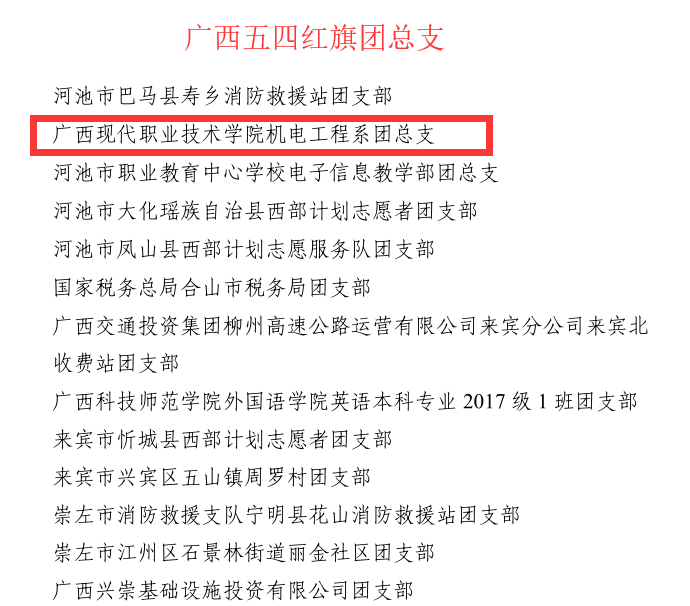 2019年,我系团建工作成效显著。在刚发布的《广西共青团 广西青年联合会关于表彰广西共青团先进个人和先进集体的决定》(桂青联发〔2020〕4 号)文件中,机电工程系党总支荣获“广西五四红旗团总支”荣誉称号;我系班主任、团委王友高副书记荣获“广西优秀共青团干部”荣誉称号;我系18机器人衔接2班苏梁倩同学荣获“广西优秀共青团员”荣誉称号。热烈祝贺获奖的集体和个人!希望受表彰的集体和个人,珍惜荣誉,再接再厉,再创佳绩。