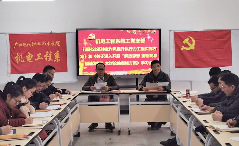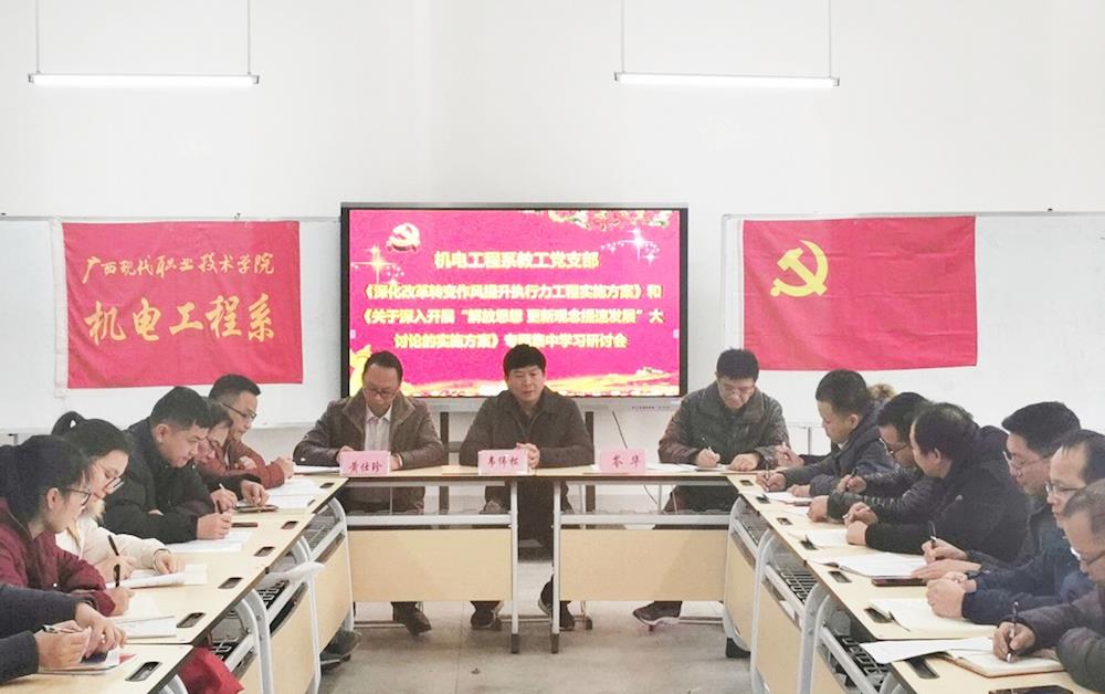 机电工程系党总支于1月14日下午15:10—18:00,对学院“两个方案”进行了深入解读、领会、学习;1月15日上午8:30—12:00,在昨天下午学习的基础上,继续对“两个方案”进行了专题集中学习研讨,学院党委韦伟松书记莅临指导。专题集中学习研讨会上,部门班子领导、全体党员、教研室主任,均结合部门和个人工作实际,认真查摆在政治素养、思想观念、工作作风和执行力方面存在的问题,并进行逐一发言,开展了第一阶段的解放思想大讨论。最后,韦书记做重要讲话。