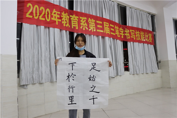 为进一步传承和发扬中国书法文化,激发学生对祖国灿烂文化和语言文字的热爱之情,展示我系师范生风采,提高师范生文字书写水平,我系于2020年11月10日举行了“教育系书法技能暨第三届三笔字书写技能比赛”,由覃始洋、蒙家辉、韦荣周担任比赛评委。