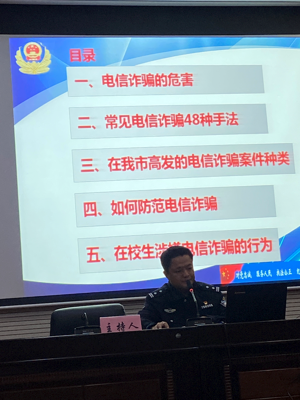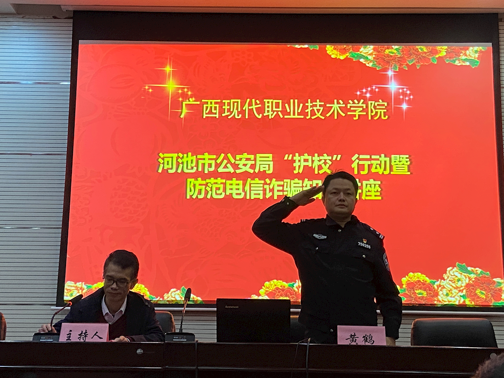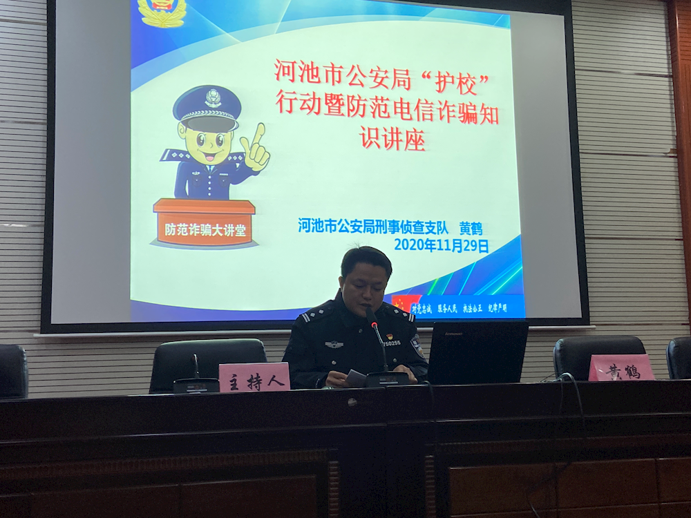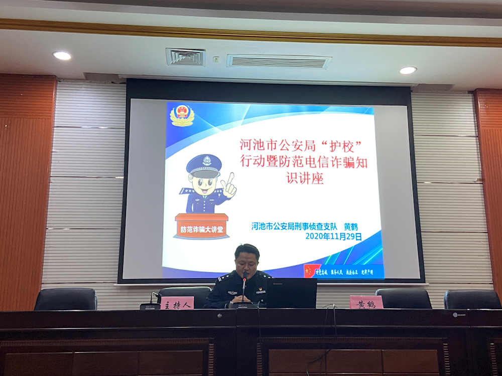 为广泛宣传防电信诈骗,提高校园师生对电信诈骗手法的识别和防范能力,11月29日晚19:30分,教育系师生代表参加了河池市公安局开展的主题为《防范电信网络诈骗》知识讲座,我系本次参会的人员有系书记、全体辅导员、各班班长以及各班安全委员。