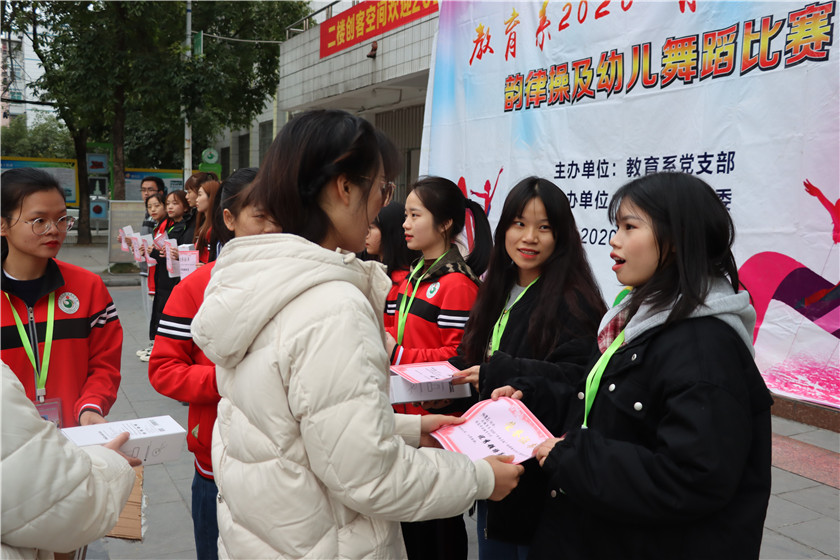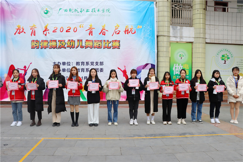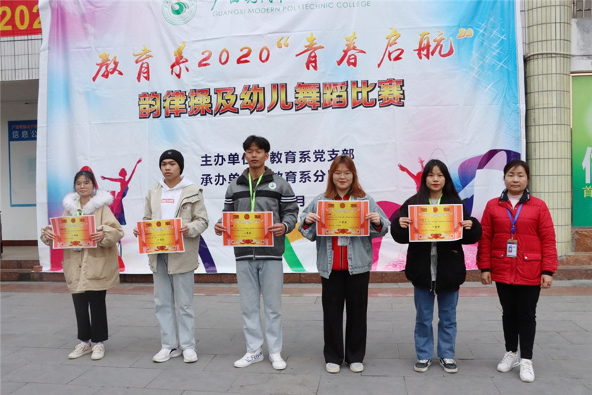 本次活动主要是对我系2020“青春启航”韵律操及幼儿舞蹈比赛的获奖班级进行颁奖,以及对优秀领操员进行了表彰,并颁发荣誉证书,此次活动邀请了教育系党支部黄耀主任、覃琳琳书记、教育系分团委容婕书记、教育系分团委韦静苑副书记作为颁奖嘉宾。