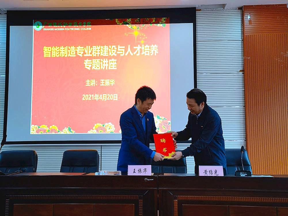 在专题讲座上,黄绍光向王振华教授颁发了客座教授聘书。王振华《智能制造专业群建设与人才培养》的专题讲座,从再认识智能制造、智能制造人才需求与专业建设现状和以智能制造系统建设带动专业(群)建设三个方面向与会师生们做了分享。他指出,智能制造是基于新一代信息通信技术与先进制造技术深度融合,贯穿于设计、生产、管理、服务等制造活动的各个环节,具有自感知、自学习、自决策、自执行、自适应等功能的新型生产方式。当前智能制造市场规模巨大,人才需求巨大,从宏观的角度来看,智能制造装备升级、绿色制造智能升级、优质制造智能升级、工业软件应用与维护、工业智联网与云平台领域需要大量的智能制造应用型人才。但是,目前职业院校智能制造人才的培养还不能完全满足企业的需要,职业院校智能制造专业(群)建设还面临着五大挑战,并给出了五点建议。