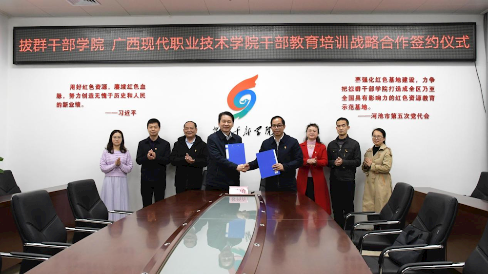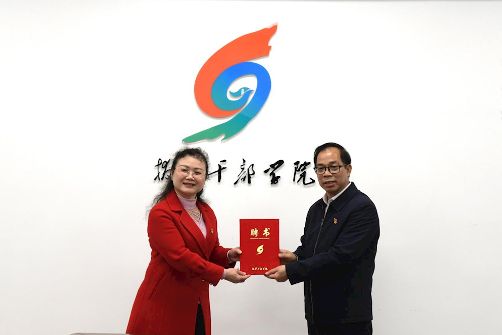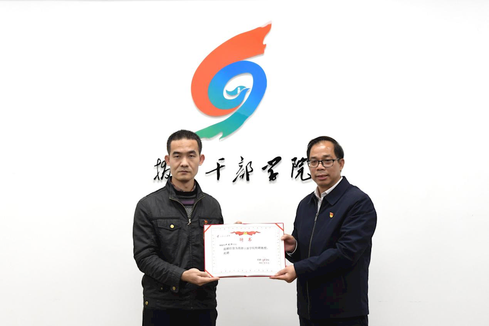 随后,黄绍光一行与拔群干部学院常务副院长覃英学,副院长蓝英参及相关部门负责人进行座谈交流。双方就师资共享、科研合作、党务活动、基地共享等方面深入交流与探讨,达成彼此共享共识,并举行两校干部教育培训战略合作签约仪式。会上,拔群干部学聘请我院校长黄绍光教授、马克思主义学院书记陆孟兰、副院长陆柳梅、教研室主任尹建强为拔群干部学院特聘教授。