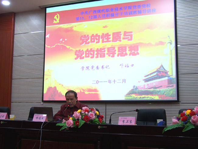 在12月6日的开班典礼上,学院党委书记邓福田发表热情洋溢的讲话。他说,大学生本来是以学习为主,但在党委党校学习意义不一样,它既是一种文化知识的学习,也是思想政治理论的学习,更是一次对人生终极理想的感悟与跋涉。你们在大学期间能这么一个经历,会给你们的大学生活增添一份青春的浓墨重彩。他对参加培训的学员提出了三点希望:立高远之志,修高尚之德,成报国之才。立高远之志,就是要坚定理想信念,坚持用中国特色社会主义理论武装自己,牢固树立正确的世界观、人生观、价值观,坚定不移地跟党走中国特色社会主义道路,努力做党的科学理论的宣传者、党的大政方针的拥护者、党的决策部署的执行者。修高尚之德,就是要大力弘扬以爱国主义为核心的民族精神和以改革创新为核心的时代精神以及广西精神(团结和谐、爱国奉献、开放包容、创新争先),努力成为社会主义核心价值体系的传承者、倡导者、实践者和推动者。成报国之才,就是要倍加珍惜学习的黄金时期,把学习摆上重中之重的位置,努力使自己成为知识渊博的人、素质全面的人、紧跟时代的人,真正成长为能负重任、可堪大用的栋梁之才。