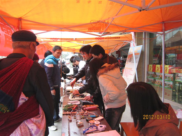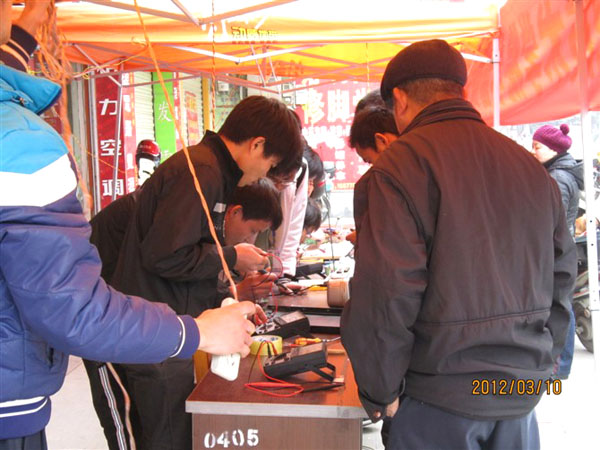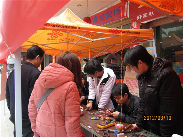 参加此次义务维修活动的人数共有30多人,大部分为电子协会会员,还有部分为我院电子电力系的同学们。通过会员们的大力宣传,周边居民热情参与,纷纷把自家损坏的家用电器拿到义务维修点进行维修。大到电脑、音响、电磁炉、电饭锅、电风扇,小到充电器、手电筒、MP3、MP4等,各式各样,品种繁多。对于一些较大的电器,会员们还主动提供搬运服务。一直到下午六点多,活动已接近尾声,还是陆续有人前来请求帮忙维修。经过统计,此次义务维修共接到各类电器35件,修复34件,修复率达到97.1%,受到周边居民的欢迎和好评。电子协会的会员们通过此次义务维修活动将所学的知识与实践相结合,施展了自己的才华,可谓学以致用。同时也用满腔的热情和无私奉献的高尚品德使雷锋精神得到了充分的阐释和进一步的升华。