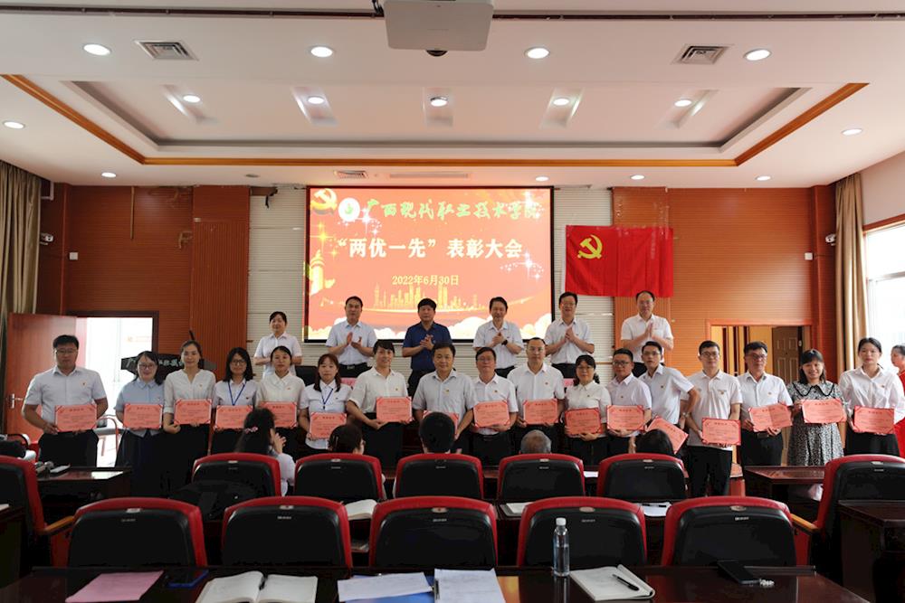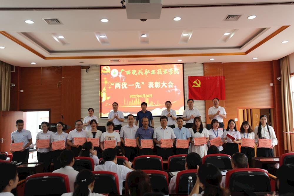 为树立典型、激励先进,推进基层党组织建设,以实干业绩迎接党的二十大召开,6月30日上午,我校在第二学术报告厅召开2022年“两优一先”表彰大会。河池学院党委副书记、学校党委书记韦伟松,学校党委副书记、校长黄绍光,纪委书记张斌,副校长卢森焕、黄耀、杨奎出席会议,全校教师党员参加会议。会议由副校长杨奎主持。