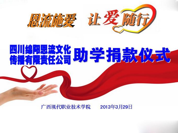 党委宣传部、学工处讯 2013年3月31日,四川绵阳恩流文化传播有限责任公司韦三鸿先生一行亲临我院参加助学捐款仪式。学工处相关负责人组织捐款仪式。