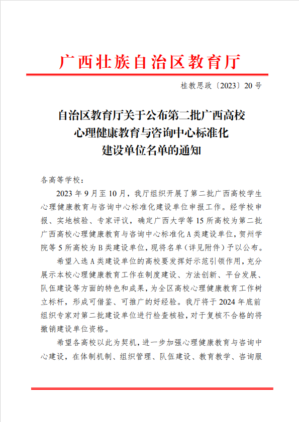 近日,自治区教育厅公布第二批广西高校心理健康教育与咨询中心标准化建设单位名单,优米体育入口官网下载手机版成功入选第二批全区高校心理健康教育与咨询中心标准化B类建设单位。