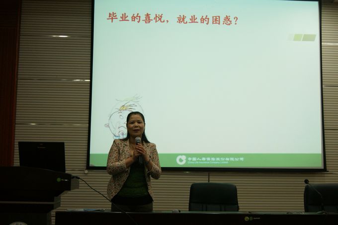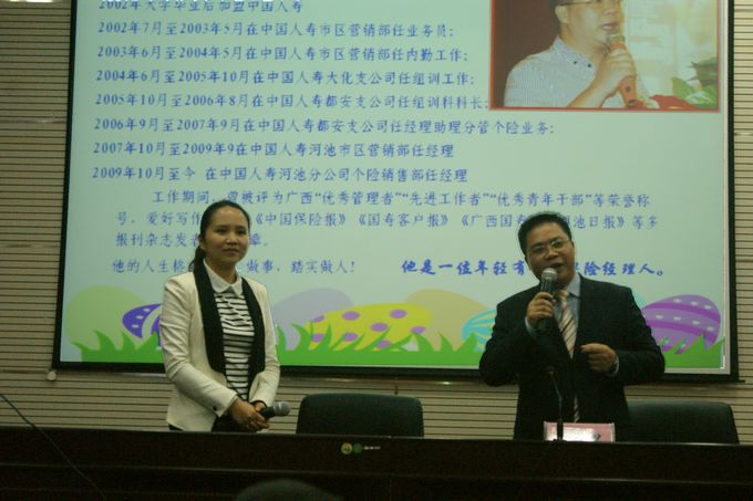 中国人寿保险河池分公司培训讲师李细珍女士做了题为“财富人生”的专题讲座,之后是有奖问答,与会同学踊跃回答问题,气氛活跃。接下来的优秀精英分享和管理人员访谈及自由交流活动,使在座同学更深入了解这个行业的发展机遇和前景。
