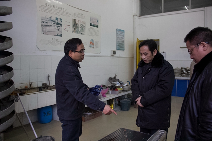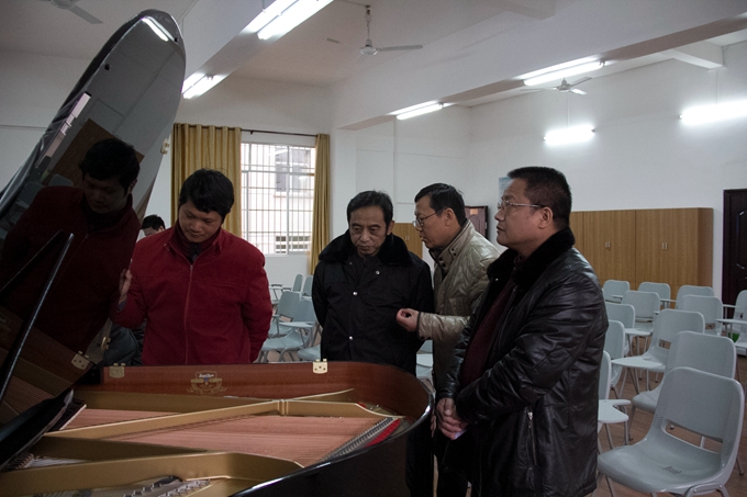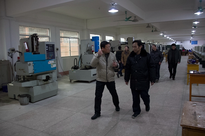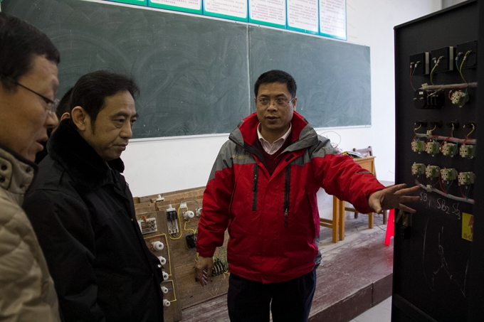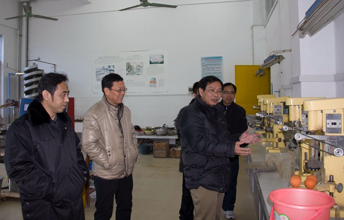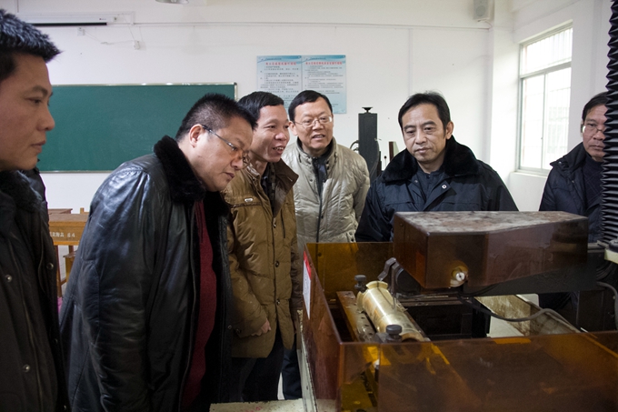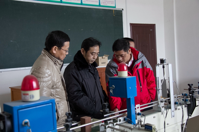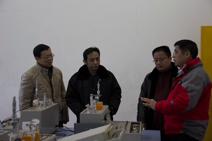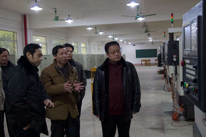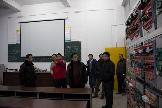 谭峰先一行先后考察了校园、美术实训室(画室)、舞蹈与形体实训室、音乐实训室、电子钢琴实训室、蒙特梭利教育实训室、幼儿园模拟教室、幼儿手工制作实训室、数控实训室、冶金实验室、化工实验室、间歇反应实验室、电子电力实训室等等。在电子电力实训室,谭峰还仔细了解了电子电力工程系的办学历史、办学规模和师资力量等情况。