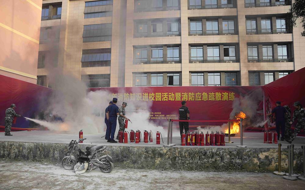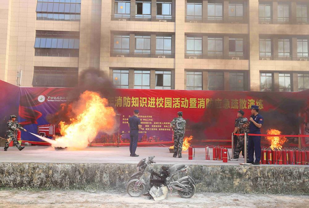 演练结束后,韦建斯给我校师生做消防安全知识讲座。他详细讲述了消防安全知识与应急处理办法,强调学生应该增强消防安全意识,掌握基本的消防知识与技能并学习应对火灾的正确处理方法。消防队员演示灭火器的使用方法,随后让学生体验使用灭火器灭火。