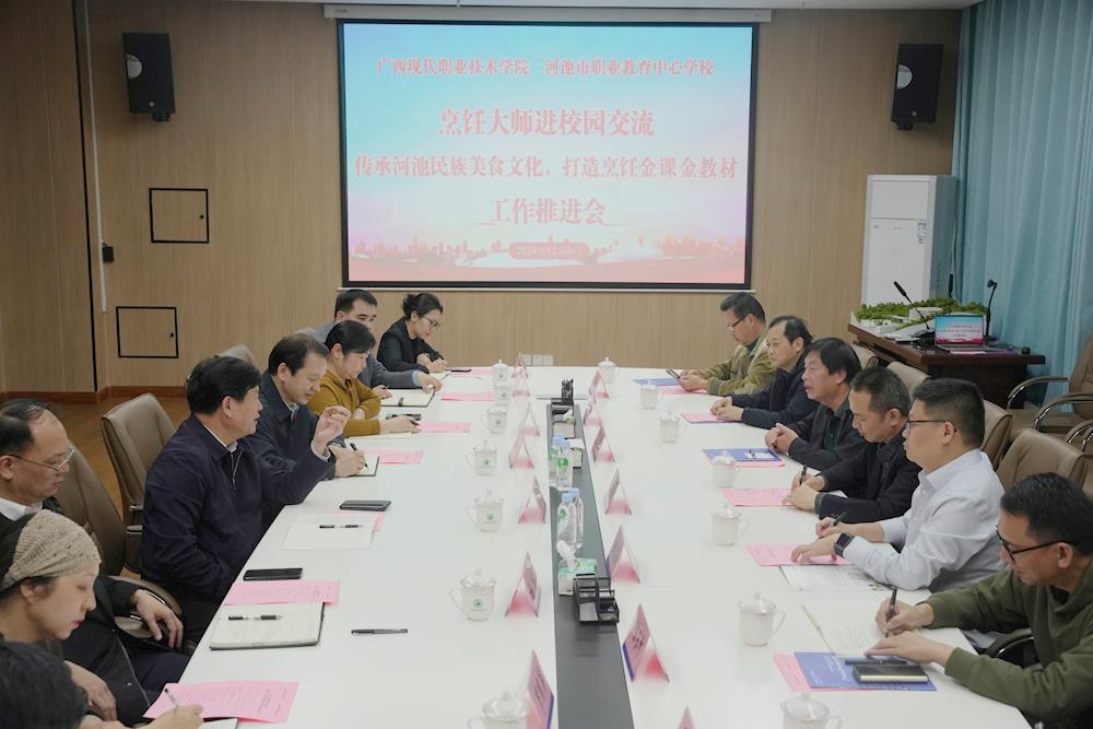 为传承和弘扬河池独特的民族美食文化,进一步推动烹饪工艺与营养专业教育与民族文化的深度融合,12月4日,我校召开传承河池民族美食文化,打造烹饪金课金教材工作推进会。河池市政协副主席、学校党委书记韦伟松,校长黄绍光,中国烹饪大师郭志鹏、梁冠强、刘阳明、蒋明刚,副校长黄耀、杨奎,商学院、河池市职业教育中心学校、上海蓝贵教育科技有限公司、广西寿乡园发展有限公司等相关部门领导出席本次会议。