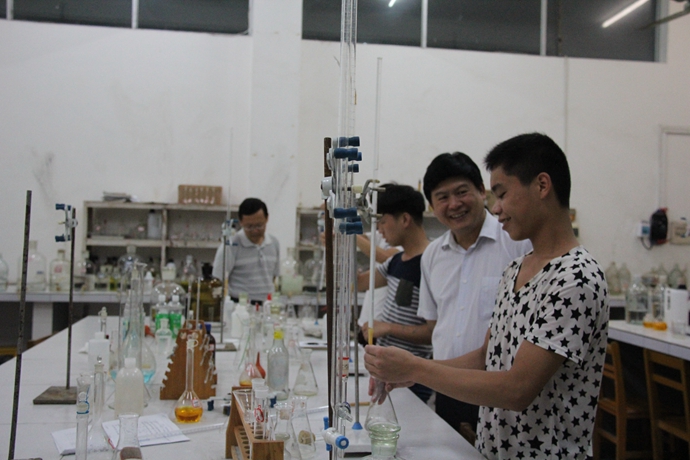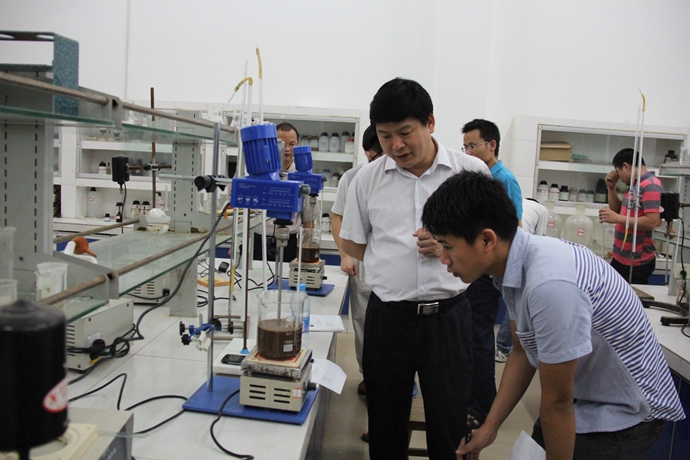 在精细化工产品实验室,韦书记随机抽查了资源工程系工业分析专业学生技能测试结果,详细查看了学生对实验设备的熟练操作情况以及实践课程的实际动手能力。韦书记对此次学生技能测试的抽查工作比较满意,他要求,教科处要将学院的教学系、教科处、院领导三级技能抽查工作推向常态化,常抓不懈,要进一步加强学生实践能力和职业技能的培养,为他们提供更好的职业技能学习平台,努力把学生们培养成高素质高技能应用型人才。