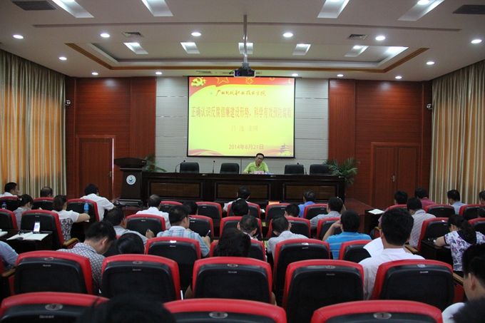 党委宣传部讯 2014年8月21日下午,优米体育入口官网下载手机版党风廉政建设专题报告会在学院第二学术报告厅举行。自治区高校纪工委副书记、监察室主任吕逸莅临我院作了题为《正确认识反腐倡廉建设形势 科学有效预防腐败》的专题报告。学院纪委书记覃志航,副院长冯忠伟出席了报告会,学院副科级以上领导干部,相关处室人员近百人参加了报告会。